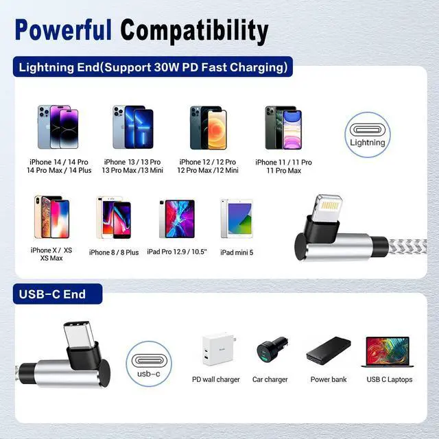 Universal Compatibility: Fully compatible with iPhone 14/14 Pro/14 Pro Max/14 Plus/13/13 Pro/13 Pro Max/12/12 Pro/12 Pro Max/11/11 Pro/11 Pro Max/XS Max/XS/XR/X/8 Plus/8, iPad Pro 12.9 gen1/iPad Pro 10.5"/iPad Air3 10.5"/iPad mini5 7.9 iPhone 7 Plus/7/6S Plus/6S/6 Plus/6(including Apple 18W, 20W, 29W, 30W, 61W, or 87W USB-C Power Adapter)