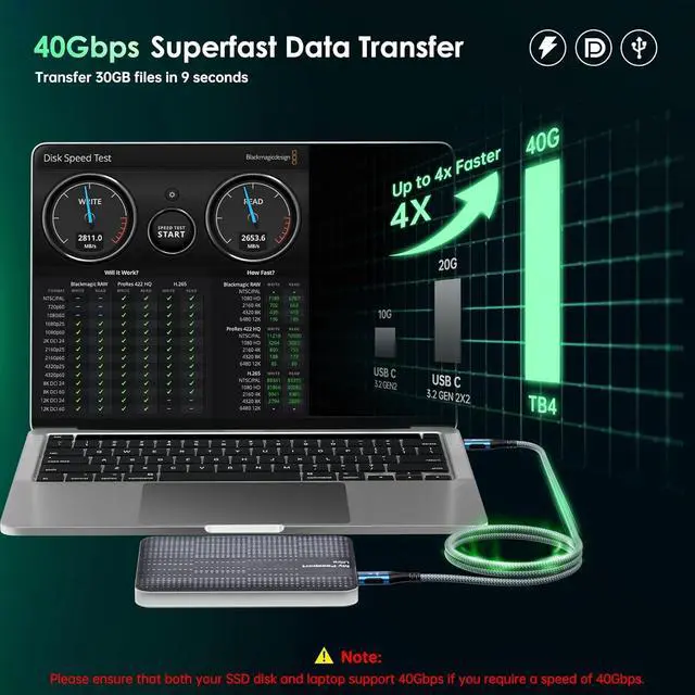 40Gbps Superfast Data Transfer: USB4 display cable for Thunderbolt 4 cable 3.3FT transfer data at speeds up to 40Gbps, allowing you to move large files effortlessly. 2.5G files can be transferred in 1 second. Note: Please ensure that both your SSD disk and laptop support 40Gbps if you require a speed of 40Gbps.