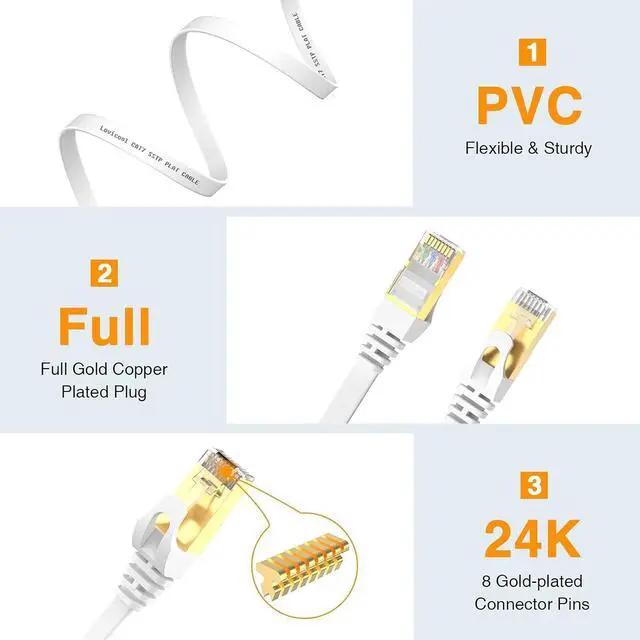 100% Bare Copper and Gold Plated RJ45 Connectors: 32AWG OFC(Oxygen free copper) and 50 Micron gold plated RJ45 plugs make the transmission efficiency up to 100%, plus sheath material PVC and insulation material HDPE, we can enjoy faster and safe speed networking