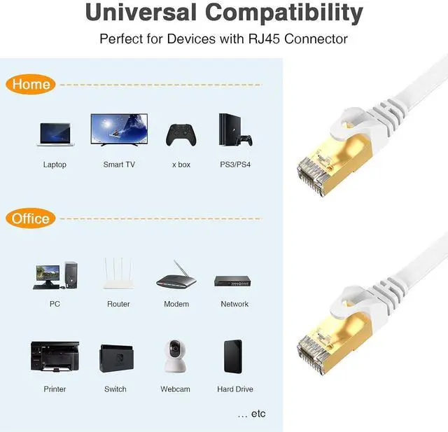 Connects Multiple Devices: Cat7 Ethernet Cable is perfect for consumer electronics TV, Apple TV, Roku, Fire TV, Macbook Air, Macbook Pro, Mac, PS3, PS4, Xbox One, Xbox 360 and provide universal connectivity for Gigabit Local Area Network (LAN), such as computer server, printer, cable modem, router, switch, hub, Desktop PC, network media players, NAS, VoIP, PoE and more