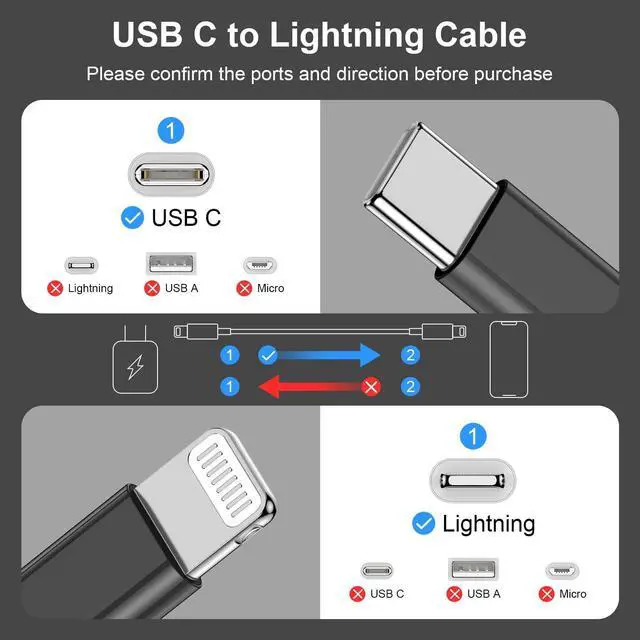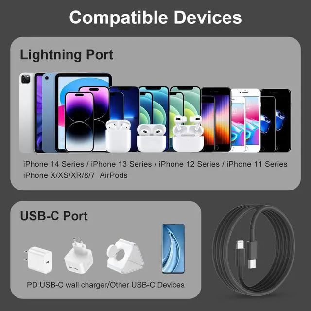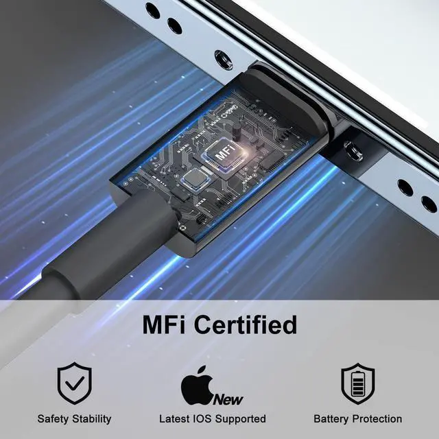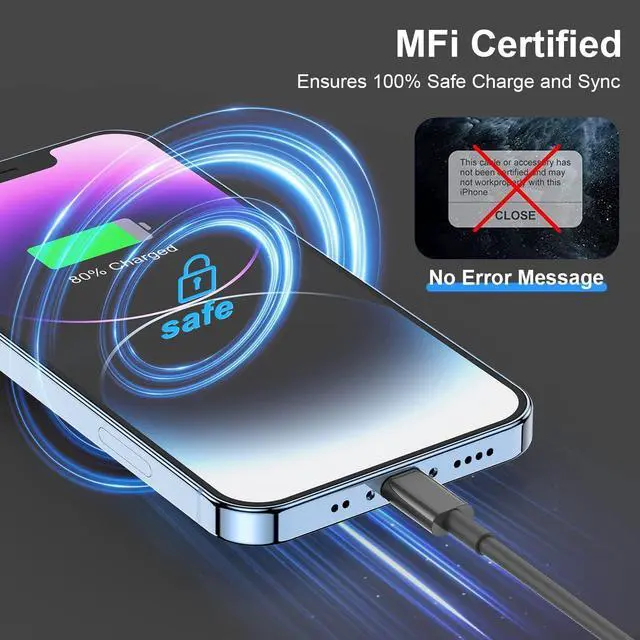 Apple MFi Certified Lightning Cable6 ft USB-C to Lightning Cable with MFi certification (Made for iPhone iPad iPod) requirements. The latest C94 lightning connector to ensure that no warning messages pop up and is designed for fast charging.