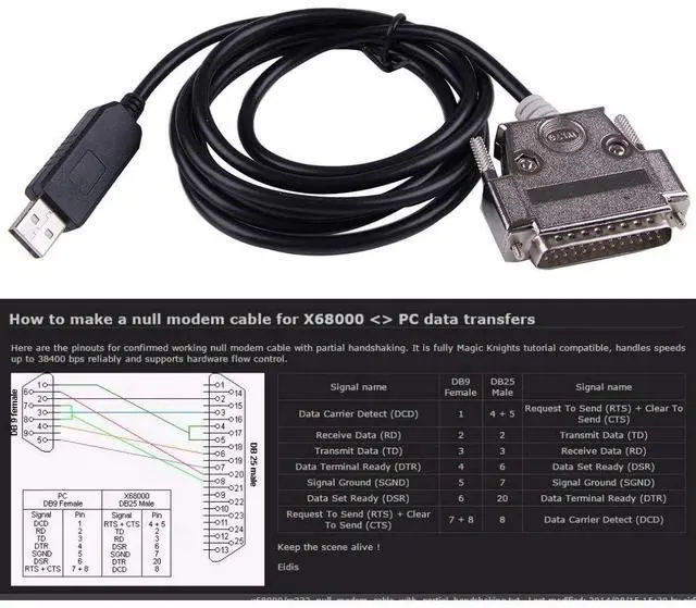 USB to DB25 RS232 Serial Adapter Converter Cable Null Modem FT231XS Driver for Sharp X68K X68000 PC Communicate Programming Cable How to make a null modem cable for X68000 <> PC data transfers Here are the pinouts for confirmed working null modem cable with partial handshaking. It is fully Magic Knights tutorial compatible, handles speeds up to 38400 bps reliably and supports hardware flow control. Signal name DB9 Female DB25 Male Signal name Chipset : FT232R+ZT213 Connector : USB to DB25 Male Serial Programming Cable Support both software and hardware handshaking. Works for Sharp X68K X68000 Replace your old DB9 to DB25 serial cable, connect DB25 port to your PC's USB port Industry standard FTDI chip set & device drivers to ensure maximum compatibility and superior reliability for industrial application Plug and play without driver installation. Works with all Windows and Mac OS versions. Heavy duty metal DB25 connector with locking screws on one end, plastic USB housing on the other end of the cable . The cable length is 6ft Data Carrier Detect (DCD) 1 4 + 5 Request To Send (RTS) + Clear To Send (CTS) Receive Data (RD) 2 2 Transmit Data (TD) T ransmit Data (TD) 3 3 Receive Data (RD) Data Terminal Ready (DTR) 4 6 Data Set Ready (DSR) Signal Ground (SGND) 5 7 Signal Ground (SGND) Data Set Ready (DSR) 6 20 Data Terminal Ready (DTR) Request To Send (RTS) + Clear To Send (CTS) 7 + 8 8 Data Carrier Detect (DCD) The X68000 (Japanese: Hepburn: Ekkusu Rokuman Hassen) is a home computer created by Sharp Corporation, first released in 1987, sold only in Japan. The first model features a 10 MHz 68000 CPU (hence the name), 1 MB of RAM, and no hard drive; the last model was released in 1993 with a 25 MHz 68030 CPU, 4 MB of RAM, and optional 80 MB SCSI hard drive. RAM in these systems is expandable to 12 MB, though most games and applications do not require more than 2 MB.