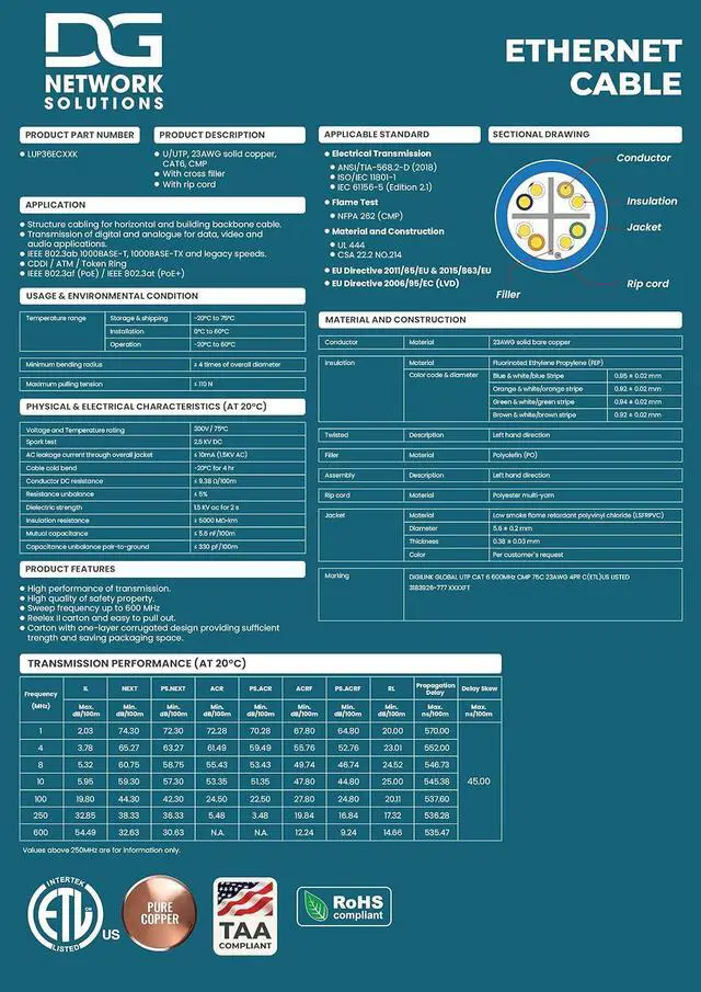BENEFITS - Be confident installing our DG Cat6 Plenum in your home or business. Certified by ETL for electrical and safety performance. Pure copper wires and TIA Compliance. Tested up to 600MHz, PoE++ and Fluke Tested.