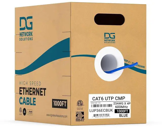 BRAND NEW PACKAGING DESIGN - Same Great Cable, DG Network Solutions Cat6 Plenum is 23AWG, Unshielded, 1000ft in an easy to use pull box. Rated for 600MHz and speeds up to 1 Gigabit at 328 feet and up 10Gb speeds up to 165 feet. Our box is a Reelex II box for smooth cable pulls.