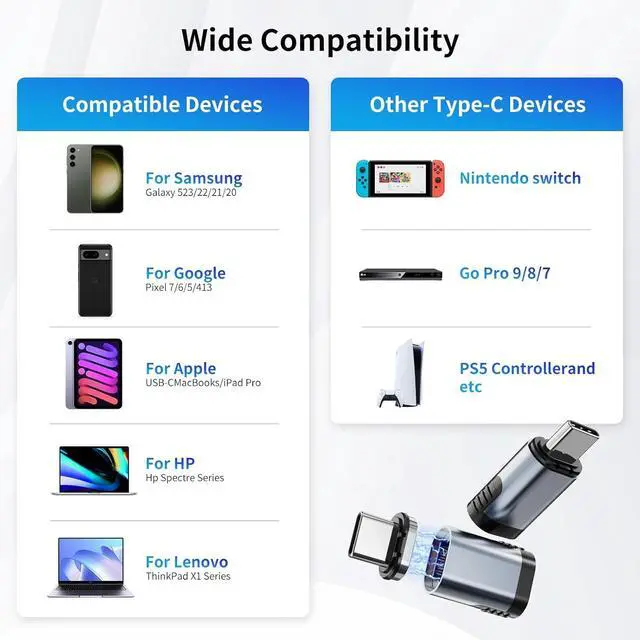 WIDE DEVICE COMPATIBILITY: The magnetic design of this USB-C adapter allows for quick, automatic, and secure connections with a wide range of devices. It is compatible with MacBook Pro, MacBook Air, Lenovo ThinkPad, Nintendo Switch, Steam Deck, iPad Pro, iPad Air, Samsung Galaxy Book, and more, making it a versatile USB C to USB adapter for various applications.