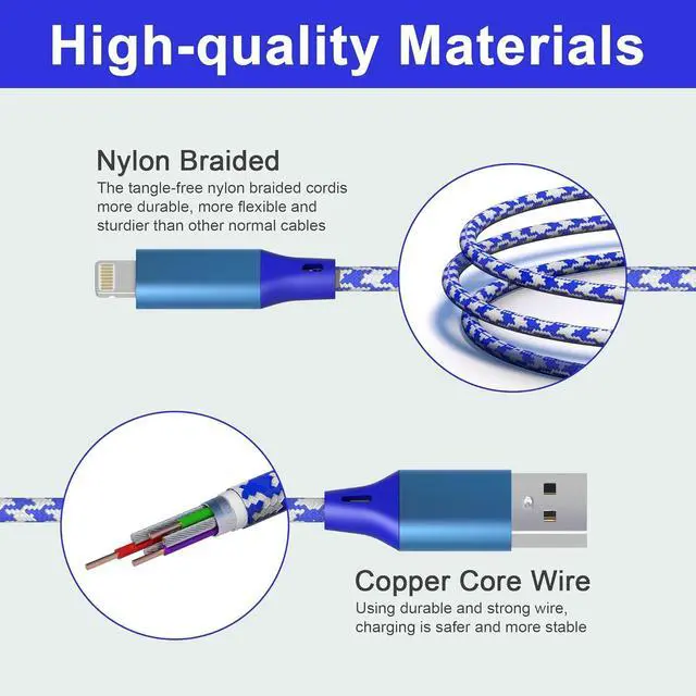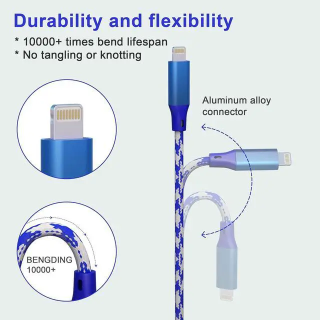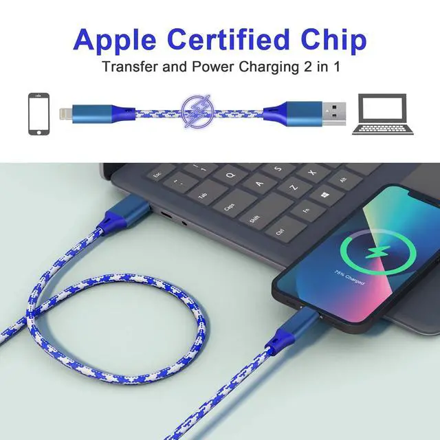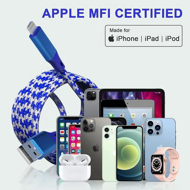 MFi Certified Long iPhone Cable: Blue 20ft Nylon Braided USB Charger cable contains an authorization chip issued to ensure 100% compatibility with iPhone. Built with terminal and smart chip. connector with a lightning end, ensured safe charging for your devices. Enjoy fast data transfer, syncing and charging
