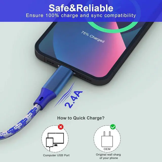 Fast Charger & Transfer Data: High-quality Copper Wire and Nylon Braided reduced charging cable resistance enable cable to provide the fastest possible charge via any USB charger.iPhone cable coats with high quality Nylon cloth jacket and is filled with ultra-durable aramid fiber core which ensures an unparalleled 100000+ bend lifespan.iphone cable supports safe high-speed charging (2.4A) and fast data transfer (480Mbps)