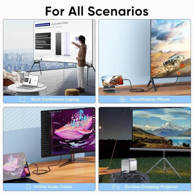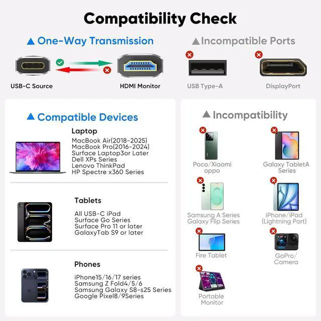Universal USB-C CompatibilityEnjoy true plug-and-play convenience! Instantly connect your USB-C and Thunderbolt 3 devicescompatible with MacBook Pro, iPad Pro, Samsung Galaxy phones, Dell laptops, and moredirectly to any HDMI display. No adapters or drivers needed.