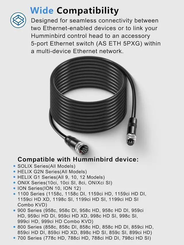Ethernet Devices Connection - This 20-feet Ethernet cable is designed for seamless connectivity between two Ethernet-enabled devices or to link your Humminbird control head to an accessory 5-port Ethernet switch (AS ETH 5PXG) within a multi-device Ethernet network. It's an essential component for expanding your marine electronics setup, ensuring reliable communication across your devices