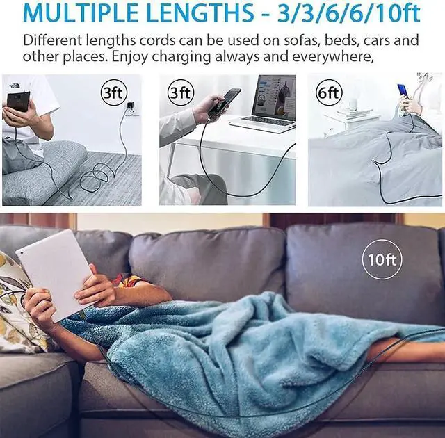 MULTIPLE LENGTHS - 3/3/6/6/10ft - Different lengths cords can be used on sofas, beds, cars and other places. Enjoy charging always and everywhere, without worrying about taking the cable anywhere.