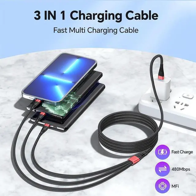 3 in 1 Charger DesignUpgraded USB cable, featuring a universal multi port design, it can charge most mobile phones on the market, When you go out, you only need to carry one cable in the car, office, home or travel without carrying any other data cable.