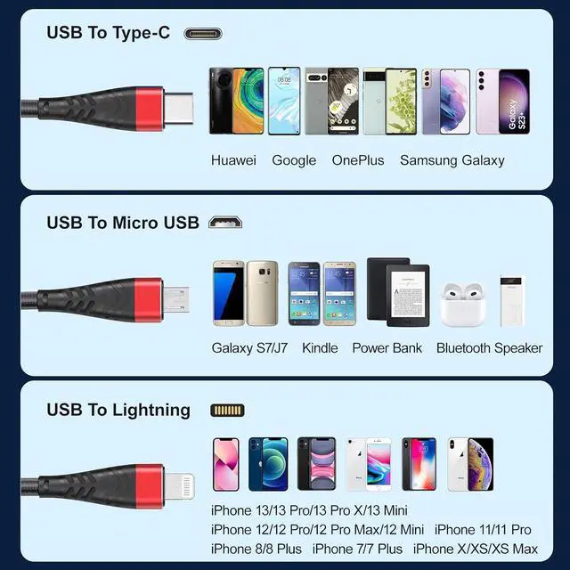 Perfect compatibility The multiple charger cord is suitable for all phones, for Lightning/USB Type-C/micro USB port phone.Compatible with iPhone 14/13/12/11/Pad/for Samsung S23/22/20/Android Phone/HTC/for Nokia/LG/for Sony/GPS and more.