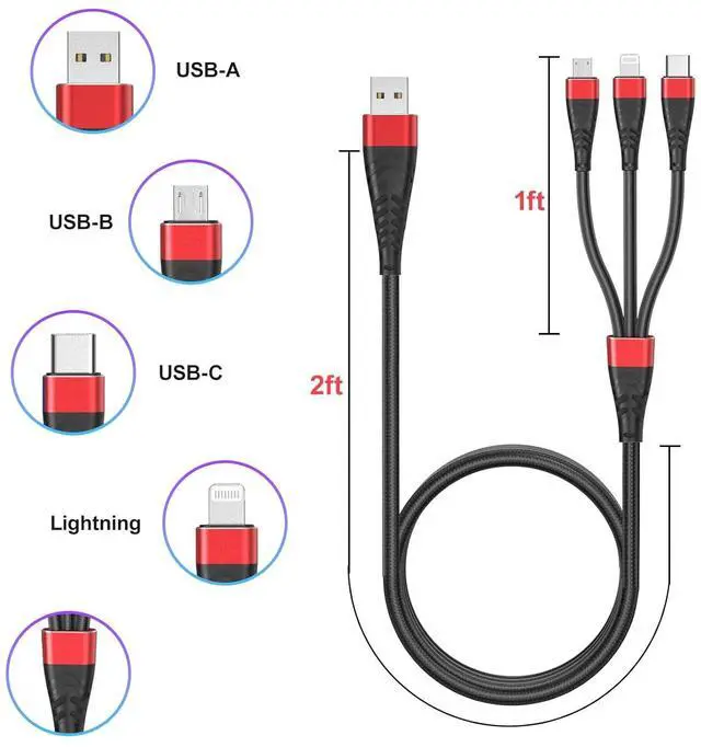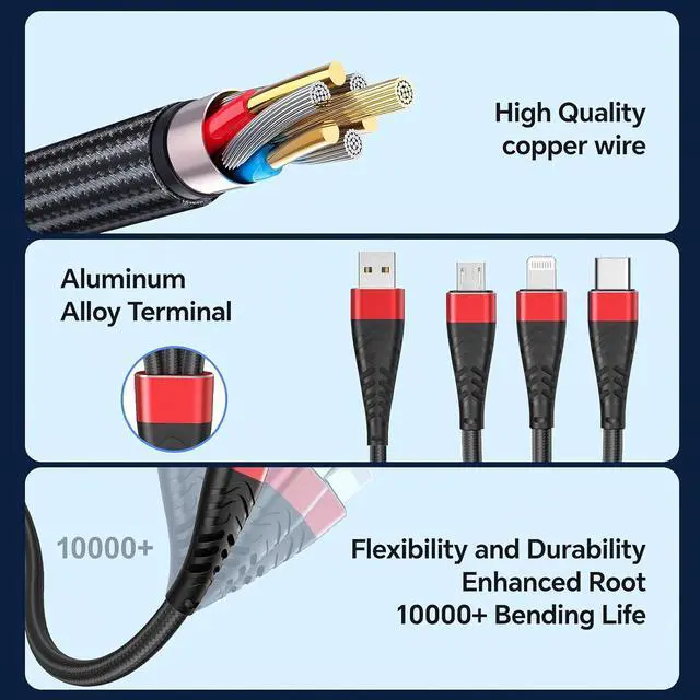 High Quality Material The chargers for multiple devices is designed and made of Nylon Braided material, with a built-in high-purity copper core, intelligent chip, overcharge protection, and stable current protection. The high-quality aluminum casing makes the cable more durable, heat-resistant, and corrosion-resistant. After 20000+ bending tests, it ensures a longer service life.