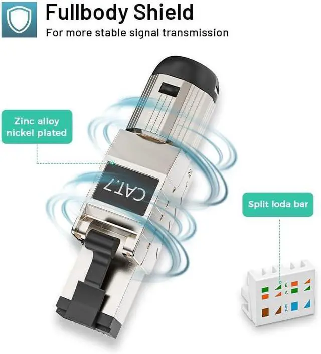 Full Metal JacketFull metal jacket RJ45 field terminable plug for Cat 7 cable assemblies, wireless access points, and network switch and server connections; Rugged metal alternative to RJ45 modular plugs.