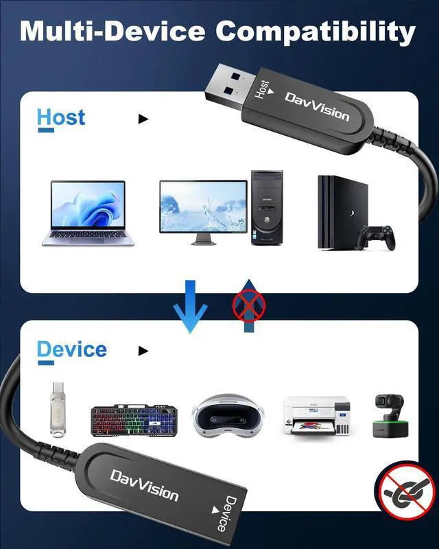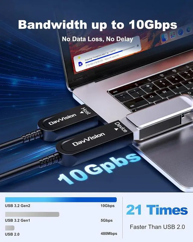 10Gbps High Speed Data Transfer: DavVision USB active optic cable built-in optical conversion chip for 10Gbps data transfer via optical signals, ensuring zero latency,zero data loss & electromagnetic interference.Backward Compatible with USB 3.0 & 2.0.