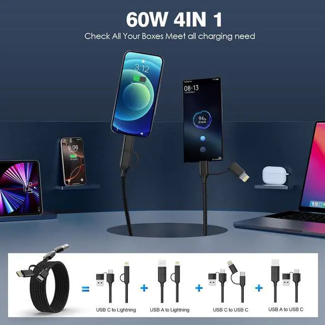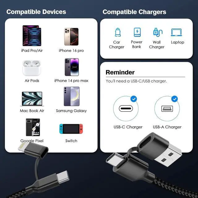 4-IN-1 Switch CableLightning and type c switch Multi usb c cable can fit any Lightning or USB C devices. extra long iphone 16 charger cord also Also desin with USB A and USB C dual-input ports; compatible with all chargers featuring USB-C or USB-A ports.