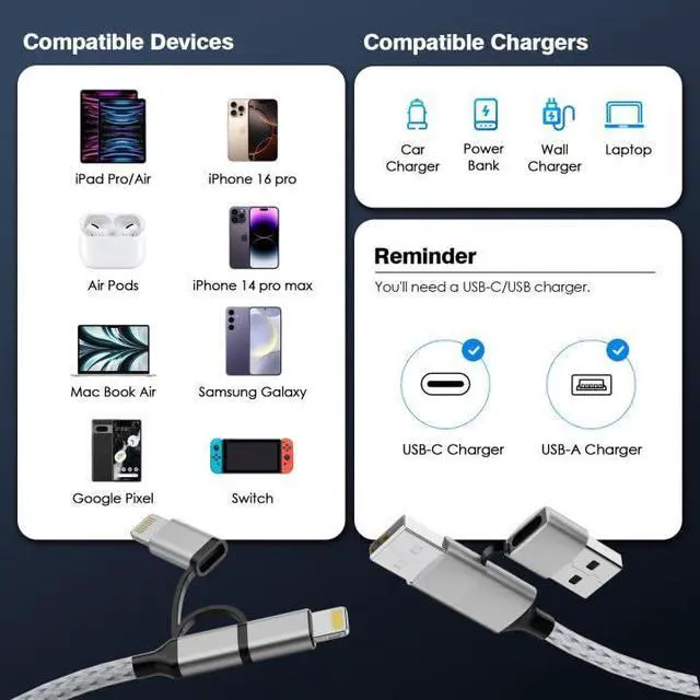 4-IN-1 Switch CableLightning and type c switch Multi usb c cable can fit any Lightning or USB C devices. extra long iphone 16 charger cord also Also desin with USB A and USB C dual-input ports; compatible with all chargers featuring USB-C or USB-A ports.