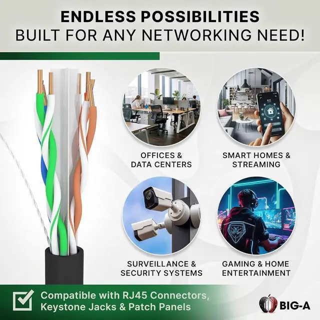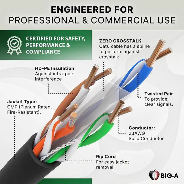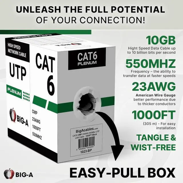 Package Includes: 1000 Feet Cat6 Ethernet Cable is a CMP UTP Bulk Wire, 550 MHz - Black