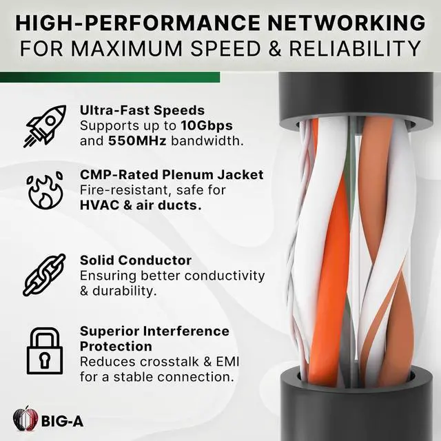 23 AWG Cat 6 Plenum Cable Unshielded Twisted Pair Construction - Crafted with copper-clad aluminum (CCA), provides reliable performance, supporting data transfer speeds up to 10 Gbps and a 550 MHz bandwidth