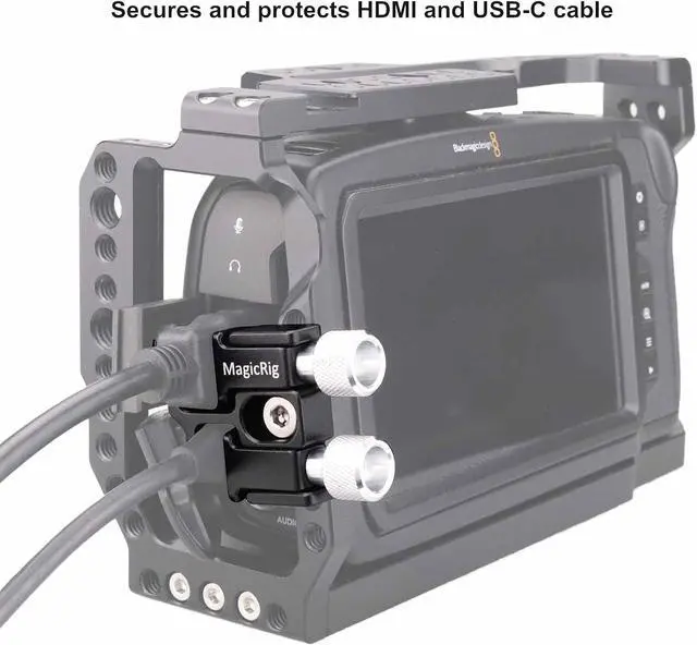 LockingSecures cable via knurled screws. The cable clamp prevents the camera's HDMI and USB-C cables from being accidentally disconnected.