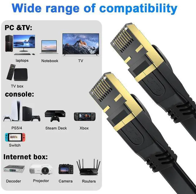 • Cat8 internet cable is compatible with Cat5, Cat5E, cat6, cat6A and Cat7 devices, and is applicable to network switches, routers, modems, PS3, PS4, X-boxes, patch panels, servers, network printers, laptops, couplers, hubs, Smart TV and any other devices with RJ45 connectors.The external material is made of environmentally friendly PVC, which meets the EU REACH and ROHS environmental regulations.