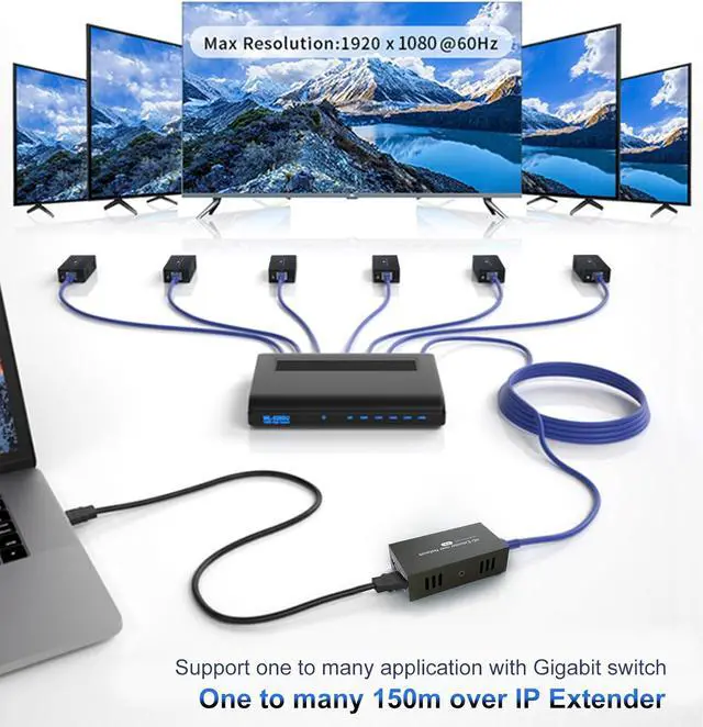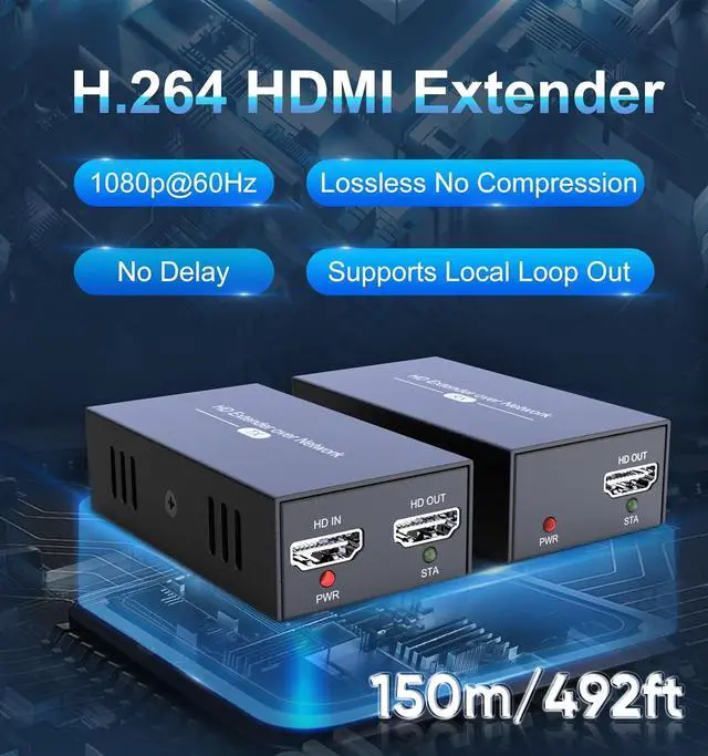 HDMI Extender Signal up to 150 m/492ftour products have powerful signal transmission capability, which can extend HDMI signal cat5e/6 cable up to 150m/492ft without any loss. Whether you are arranging a conference room, home theater or other places, it is convenient to realize the flexible layout of the equipment. Please note: To ensure reliable transmission distance, please use high-quality CAT5e/6 or higher-specification Ethernet cables.