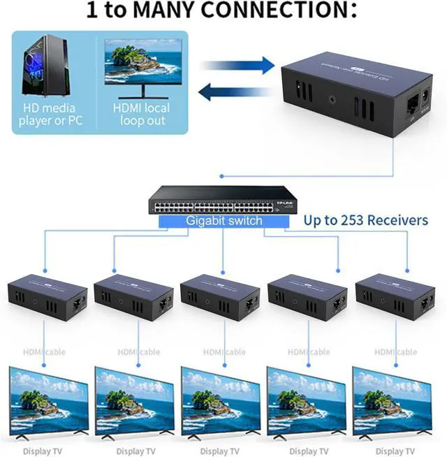 HDMI Extender One to ManyThis HDMI extender not only support one to one transmission, but also support one to many (up to 1TX to 253RX).When you use in one to one ,You just need to connect the RJ45 cable between TX and RX.When you use in one to many.You must need a Gigabit switch(This product realizes one to many signal transmission through Ethernet protocol);Please note:This product doesnt use with Home routers.Users need buy the network switch separately.