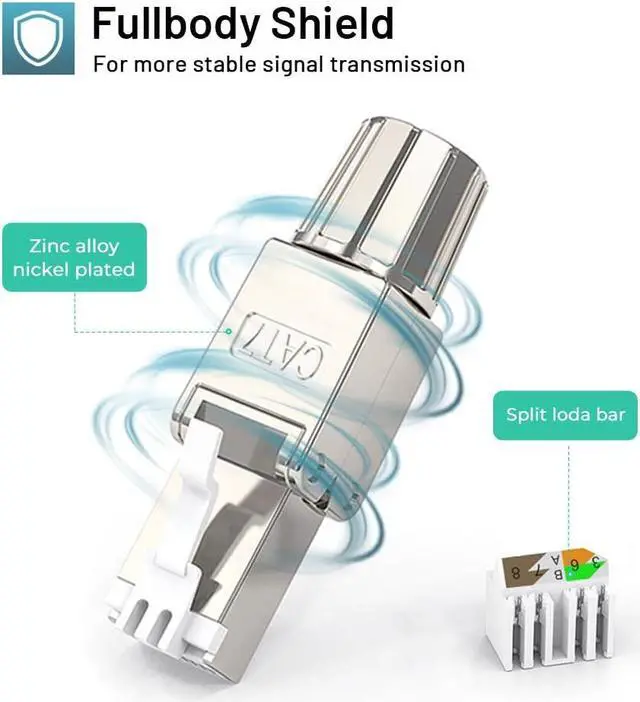 Full Metal JacketFull metal jacket RJ45 field terminable plug for Cat 7 cable assemblies, wireless access points, and network switch and server connections; Rugged metal alternative to RJ45 modular plugs.