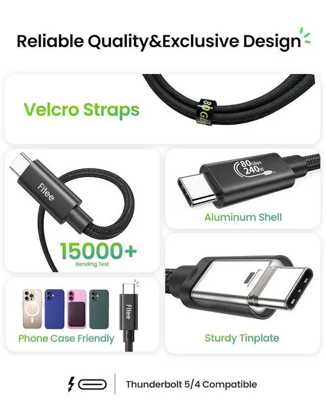 80Gbps Data TransferFitee USB 4 Version 2.0 cable delivers a lighting-fast 80Gbps bidirectional data transfer speed, back up 6GB files in 1s. Reduce your waiting time and increase efficiency. This USB C data cable is fully compatible with Thunderbolt 5, ensuring top-tier connectivity.