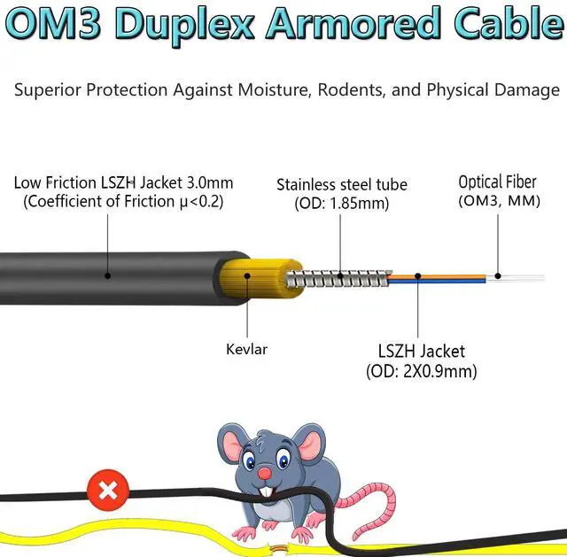 Armored for Strength- Our LC fiber jumper cable features a stainless steel tube inside to protect the inner core (fiber glass) from damage caused by pets and other external factors. It is pressure-resistant, wear-resistant, and heat-resistant, making it highly durable for outdoor use.