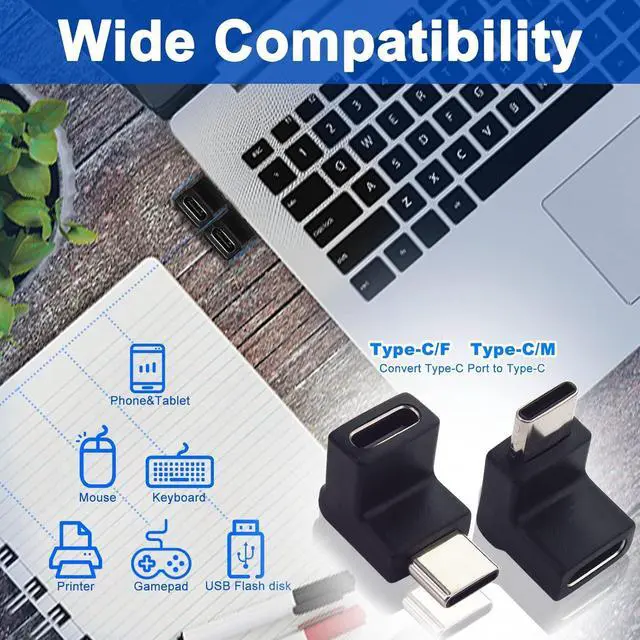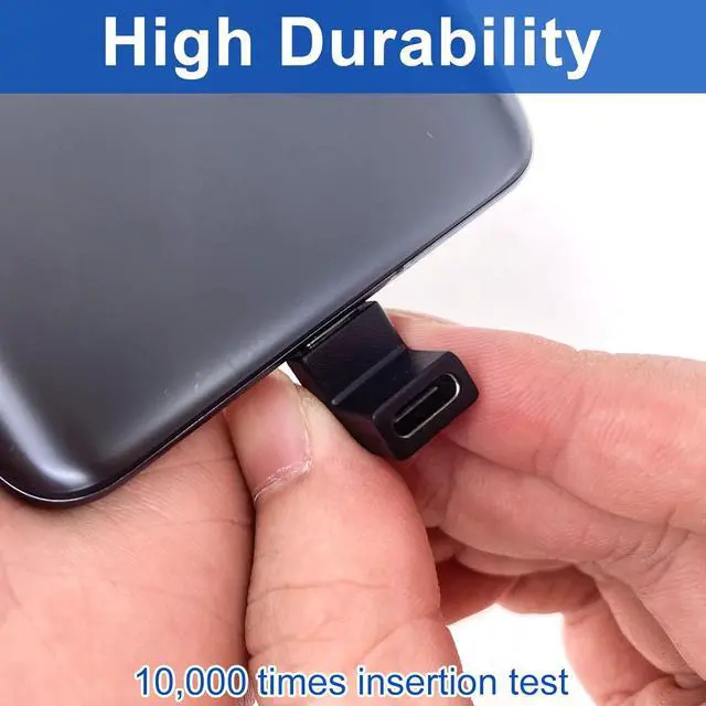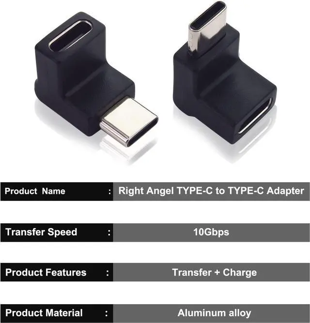 Sleek and Durable Design Right Angle USB Type C Male to Female. With 90 degree design, Right angle usb c adapter it's convenient for cables to plug in & off and protect your cable by reducing the strains of everyday use ,avoid the over-bending of straight cables which affect the service life,also reduce wear and tear on your USB-C device. Durable aluminum alloy to ensure Type C Connector won't wear out over time.