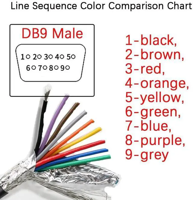 DB9 line sequence color comparison table: 1-black, 2-brown, 3-red, 4-orange, 5-yellow, 6-green, 7-blue, 8-purple, 9-grey.