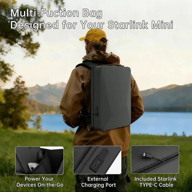 Integrated Power & Unplugged Freedom: Our starlnk mini bag can help you stay powered on the go with the integrated charging system. An internal Type-C cable connects directly to your Starlink Mini for seamless operation, while an external Type-C output port allows you to charge other devices like your phone or tablet. This enables true walk-and-charge convenience