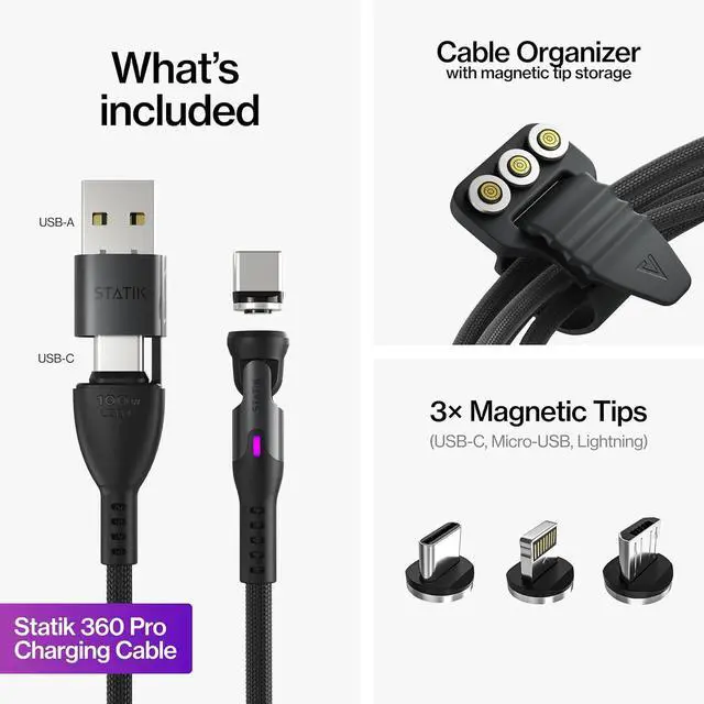 Universal for all your devices: Statik 360 Pro includes three magnetic cable tips compatible with Apple products, USB-C, MicroUSB devices. Also comes with a USB-A adapter, making it adaptable for any charging situation.