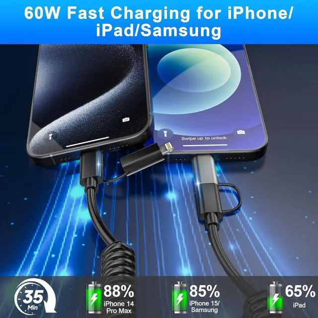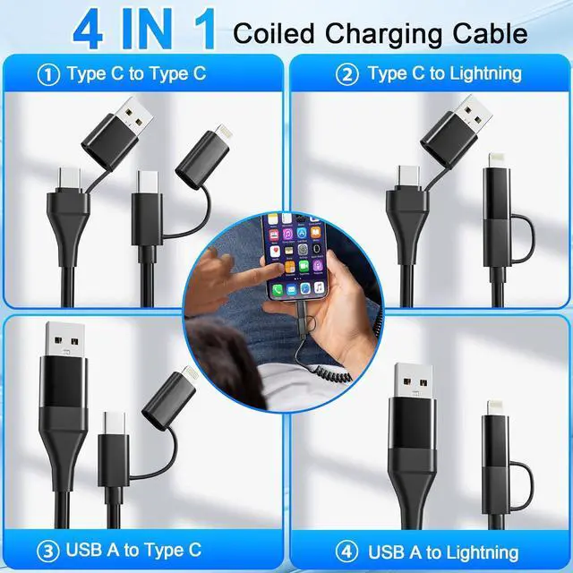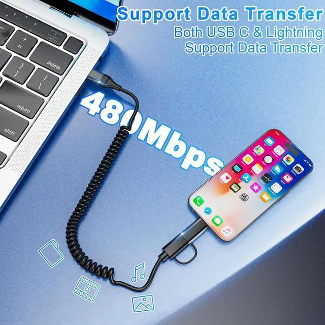 2 IN 2 Coiled Charging Cable2 IN 2 coiled usb c lightning cable fit a variety of devices, supporting USB A to USB C, USB A to Lightning, USB C to USB C and USB C to Lightning. The iPhone usb cable use retractable design, help you keep the car or jeep console neat, without hassle of long data cord clutter and tangles, perfect for use in the car