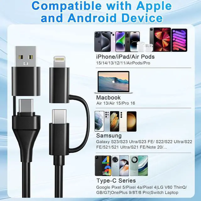 Support Apple Carplay & Android Auto2 IN 2 charging cable is perfect for your car and works greatly with Apple Carplay and Android Auto, providing a secure and stable connection to the car's entertainment system and navigation map. One cable can simultaneously solve the charging needs of iPhone 15, 14, 13, 12, 11 ect and Android phones