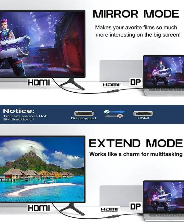 UnidirectionalConnect the DisplayPort male to a DP source device, and connect the HDMI female to display / monitor / tv/ projector by HDMI M/M cable (not inculded HDMI cable)