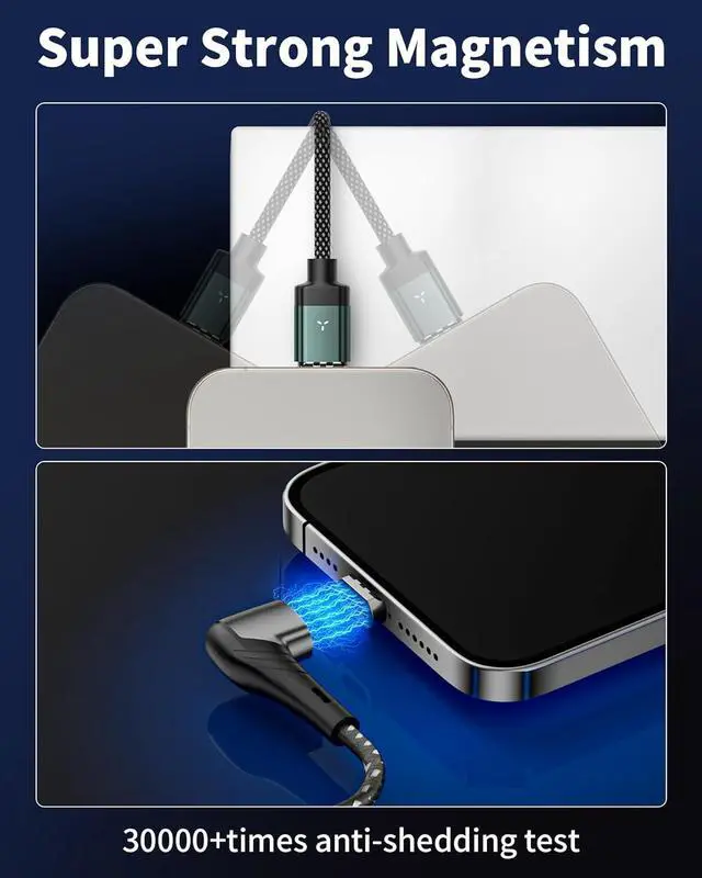 Premium Nylon Braid and Smart Chip:The magnetic Phone Charger Cable is made of premium nylon braid, which adds extra durability and kink-free, it can withstand 20,000+ bending tests. PD 3.0 fast charging cable has a built-in E-mark smart chip, which can make fast charging safer by automatically adjusting the power,support for carplay