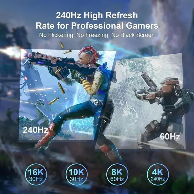 Immersive Gaming ExperienceOur DisplayPort to DisplayPort 2.1 cable supports 3D, HDR, HBR20, HDCP 2.2, Dynamic HDR, DSC1.2a, UHBR10, 3D stereo imaging technology, Auto Low Latency Mode(ALLM) and Variable Refresh Rate(VRR), 32-bit/1536kHz audio channel transmission allows you to finely detect the dynamics of enemies, making it the best choice for enthusiast e-sports players.