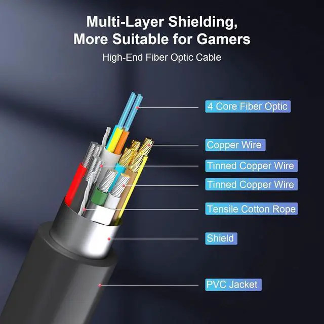 Born for Enthusiast eSports GamersThis DP2.1 cable is a four-core optical fiber with multiple internal shielding and a latch-free design. The 24K gold-plated connector is anti-corrosion and more durable. It has high anti-electromagnetic interference and anti-RF interference capabilities and can withstand more than 35,000 times. Bend tested without affecting cable flexibility and ensuring optimal performance.