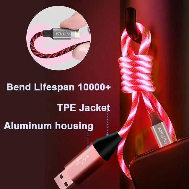 Enhanced DurabilityStrong TPE cover, the most flexible, powerful and durable material, makes tensile force increase by 200%. Can bear 10,000+ bending test. premium aluminum housing makes the cable more durable, lights up iPhone charger adds additional durability and tangles free