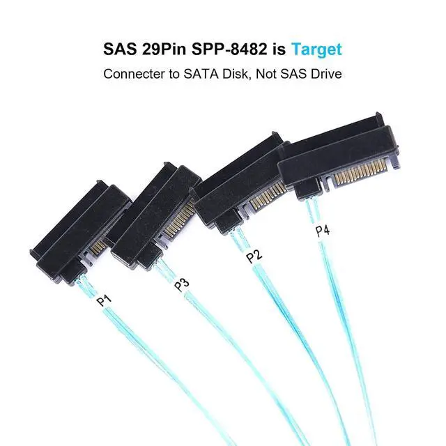 Mini sas to 4 sas/ SFF-8643 to 4 sas sff-8482, sas 8643 host connect to sas hba or pcie raid controller, mini sas to sas sff-8643 sas forward breakout link between the serial SCSI controller and the SATA disks, need to attach SATA power cables to each sas to sata adapter connector, sas 8643 8482 cable data transfer rate up to 6Gbs per drive