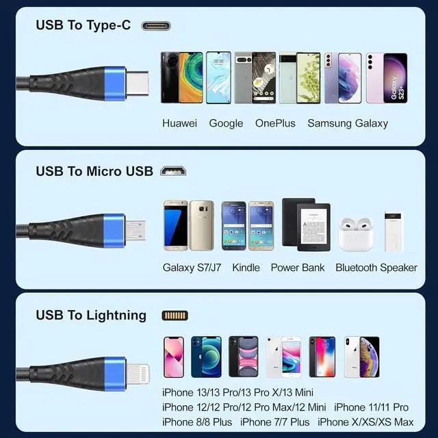 Perfect compatibility The multiple charger cord is suitable for all phones, for Lightning/USB Type-C/micro USB port phone.Compatible with iPhone 14/13/12/11/Pad/for Samsung S23/22/20/Android Phone/HTC/for Nokia/LG/for Sony/GPS and more.