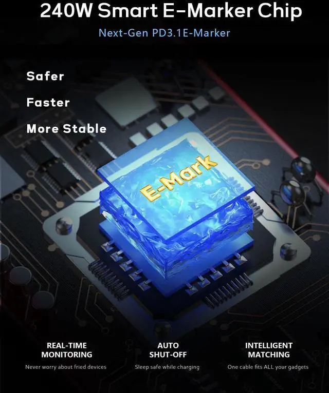 Smart E-Mark Chip: Type c to c cable The advanced chipset ensures stable power delivery and prevents overheating or overcharging