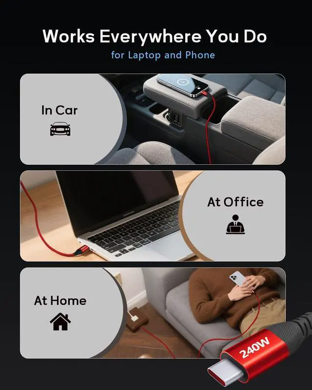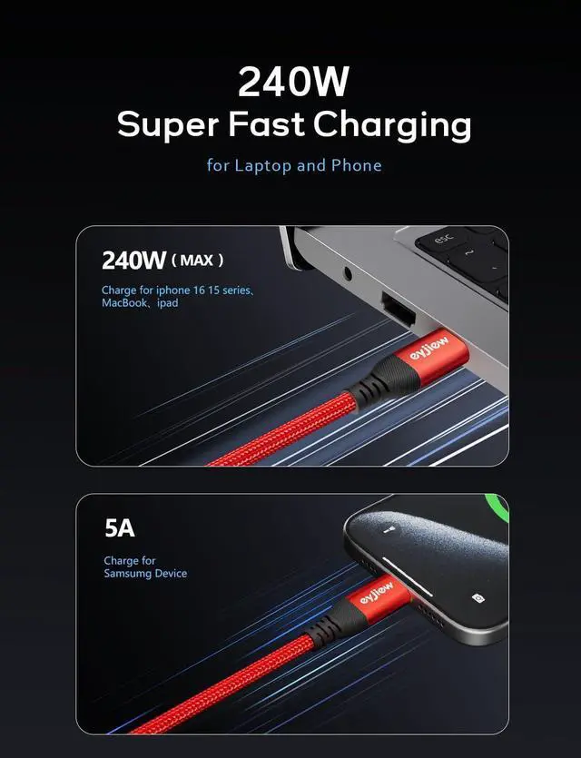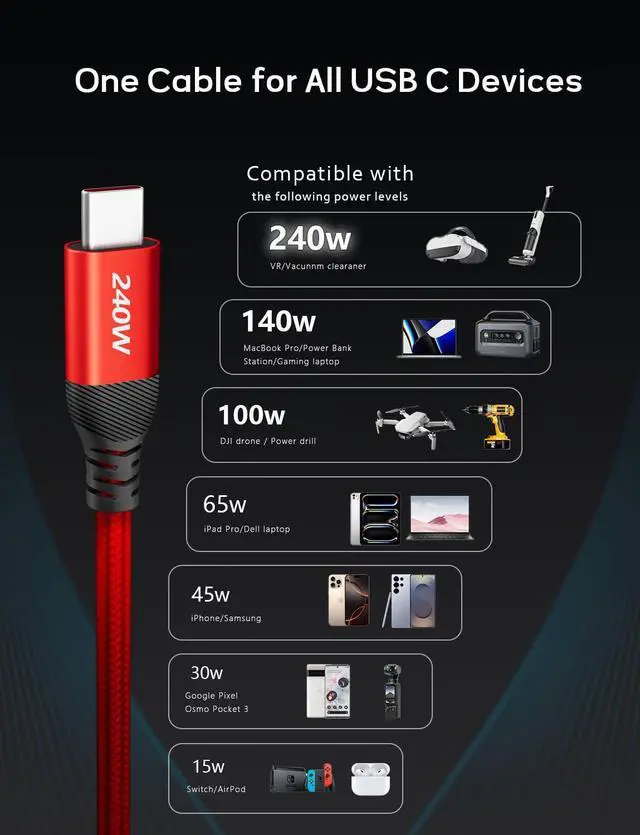 Power All Your Devices: This 240w usb-c charge cable is backward compatible with 200W/ 140W/ 120W/ 100W/ 96W/ 90W/ 65W/ 67W/ 60W/ 45W/ 25W/ 20W devices. The 5ft length offers flexibility for desk, travel, or bedside charging