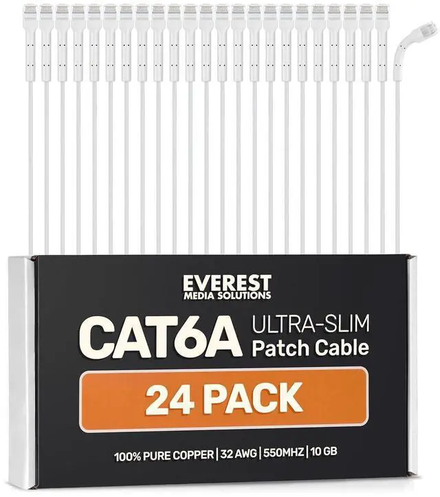 Everest Ultra Slim Cat6a Ethernet Patch Cables 10ft (24-Pack) White - 10GB Cat 6a Patch Cable - Bendable, Flexible & Thin Ethernet Cable - Space Saving 32AWG 550MHZ Cat6a Cables - 100% Copper Wires