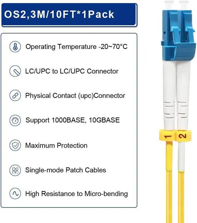 • Duplex Connector OS2 9/125m,Insertion Loss0.3dB,Return Loss 50dB. Patch Cable singlemode OS2 fiber is specially designed for fast Ethernet, Fiber Channel, Gigabit Ethernet Speeds,Local Area Networks, Data Center, Premise installation, Wide