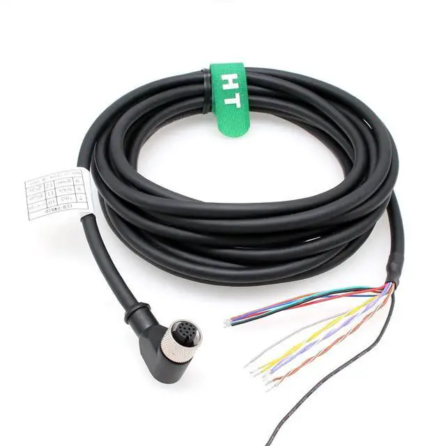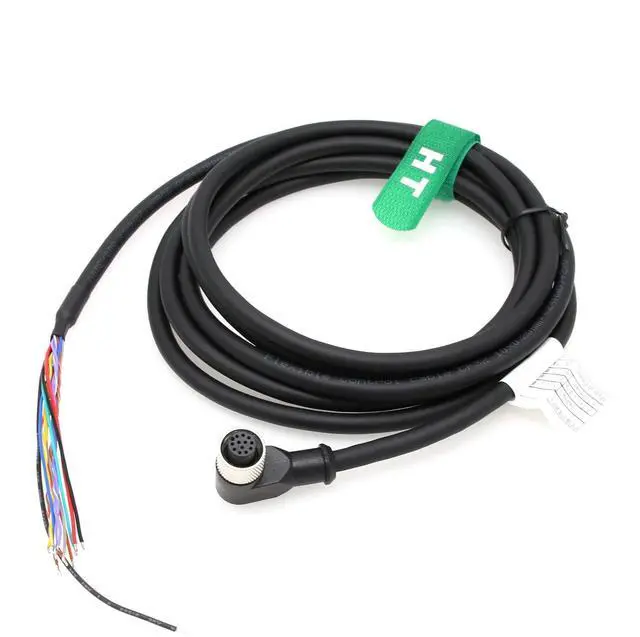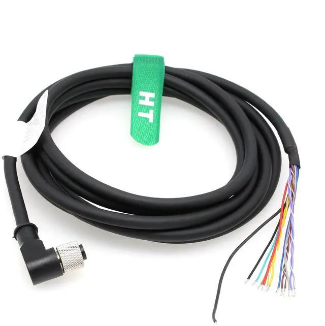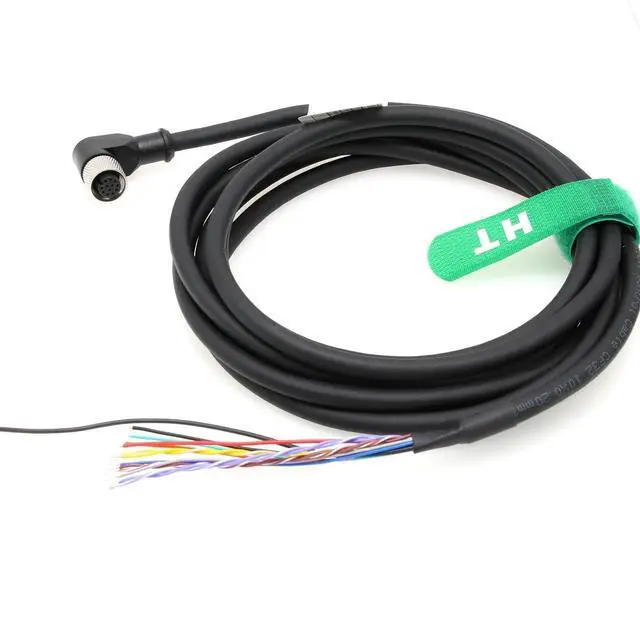 The cable has M12 A-coding 12-pin female plug connector right angle 135-degree on one end, and 12-core bare wire (also called pigtail open flying leads) on the other. Gold-plated contacts, nickel plated brass shell, waterproof, solid and durable connection. Connector with thread locking, anti-vibration, easy quick connect and disconnect