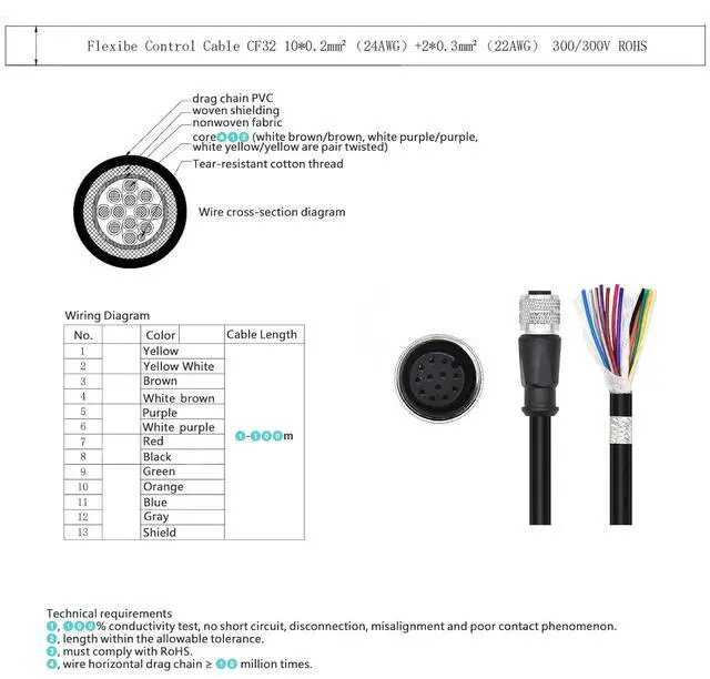 Cable with braided shielded layer, good EMC, provides shielding from electromagnetic disturbance. 23AWG wire outer diameter 7mm. High-flex heavy-duty shielded cable. Cable features: oil-resistant flame-resistant torsion- resistant and heat-resistant. Low friction black PVC material used for sheath. Cable comes with label that shows wire color correspond to each pin