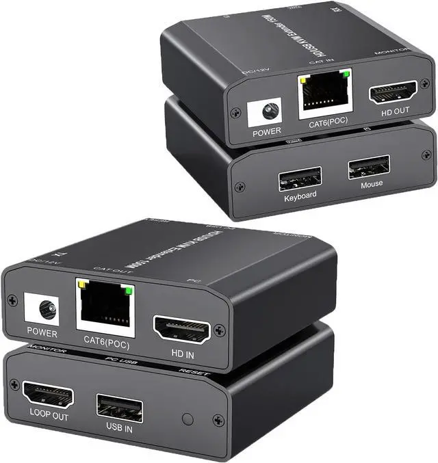 . This HDMI USB KVM extender receiver with 2 USB2.0 ports, which can allow you to control a computer system through keyboard and mouse. By transmitting keyboard and mouse data via a CAT6 cable, and you can easily control the signal source, ideal for remote control of devices such as computer, monitors and so on. Please use the USB cables to connect to the PC for the KVM extender work properly.